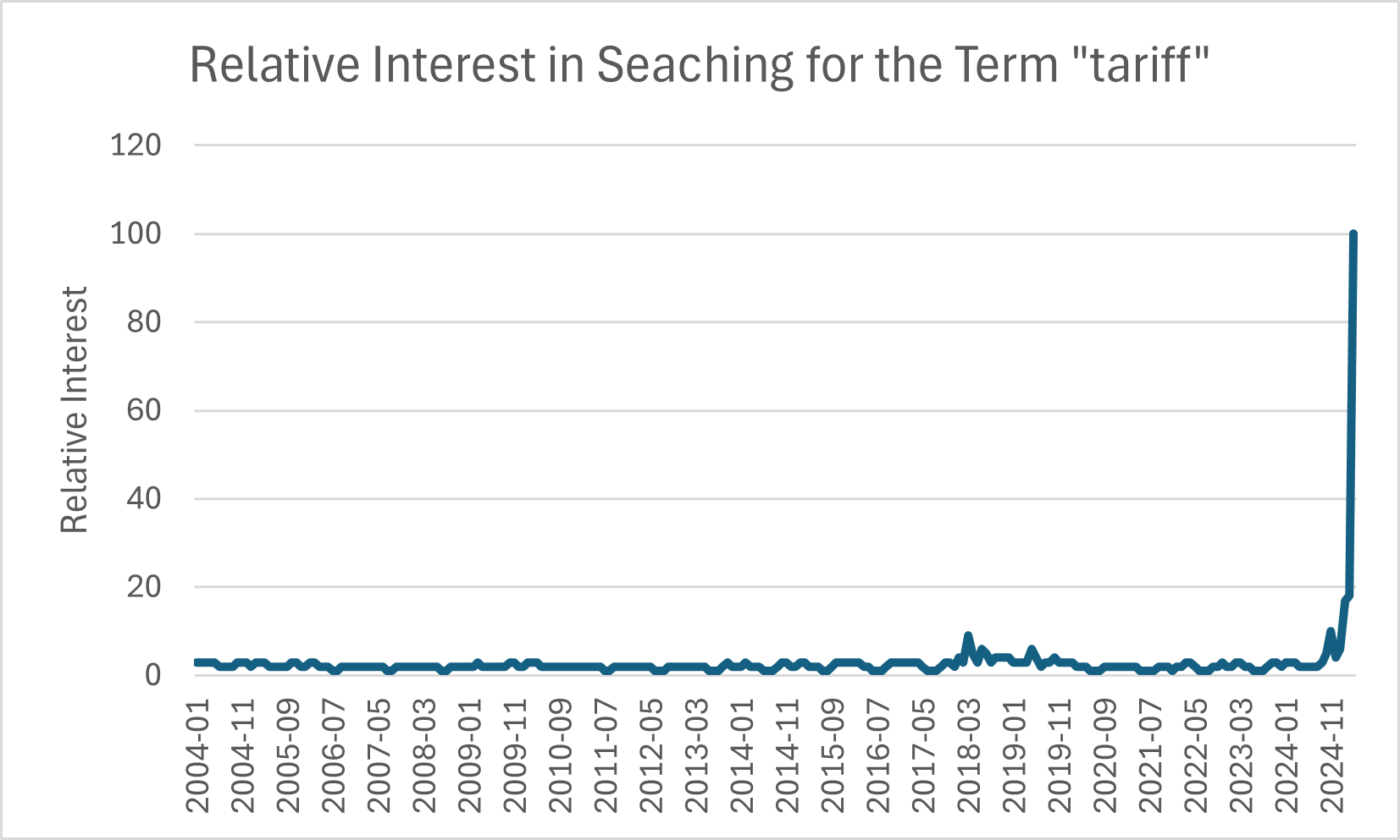 Tariff did not used to be a topic in a personal finance textbook. It belongs in an international economics or an import-export business textbook. That changed in April 2025 when President Trump declared tariffs on all countries that trade with the U.S. and sent consumers typing ‘tariff’ into search engines (Figure 4.6). In its simplest term, tariff is a purchase tax paid by businesses importing goods from another country. For example, a boutique buys t-shirts from a supplier from another country at $10 per t-shirt and sells them at $13 to its customers. The $3 mark-up covers payroll, rent, overhead, and profits to the boutique owner. If the U.S. government levies a 100 percent tariff, the boutique pays $10 ($10 x 1) to the government when the t-shirt arrives at a U.S. port. How tariffs affect the consumers depends on a number of factors. One extreme scenario is that the boutique passes the entire $10 tariff to its customers and now sells the t-shirt at $23. Another extreme scenario is that the supplier lowers the wholesale price from $10 to $5, absorbing all the burdens from the tariff. The most likely scenario includes a combination of negotiating with its supplier, taking a smaller profit, cutting payroll and other costs, and increasing prices. For instance, the supplier may lower the wholesale price to $8 to the boutique, resulting in a $8 tariff. The boutique lowers its mark-up to $2. The final price to the consumer goes up to $18.